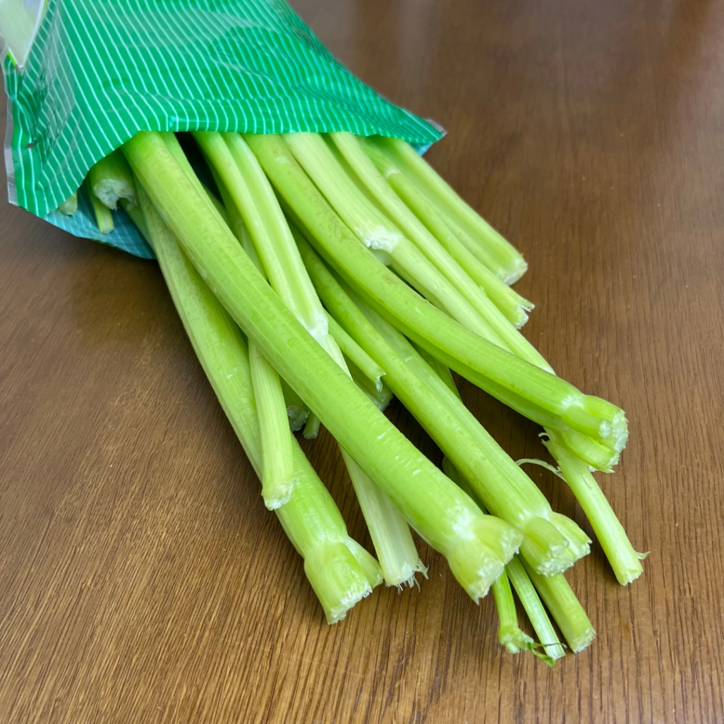 袋を開けてまず驚くのが、その香りの優しさです。 日本のセロリは「うわ、セロリだ!」という鼻に抜ける強烈なパンチがありますが、これはもっと爽やか。色も少し白っぽくて、見るからにみずみずしいんです。