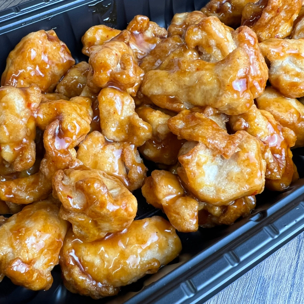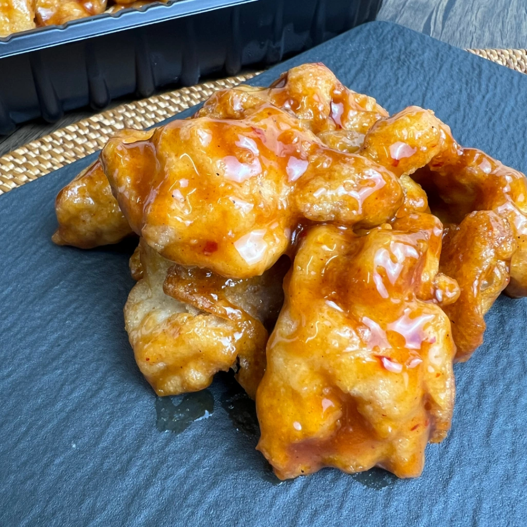 鶏もも肉のフライドチキンに、厚めの衣がしっかりとついています。この衣がミソで、特製のオレンジソースをこれでもかというほど吸い込んでいるんです。一口食べると、醤油ベースの甘じょっぱい味がガツンと来て、後からほんのりオレンジの香りが追いかけてくる感じ。