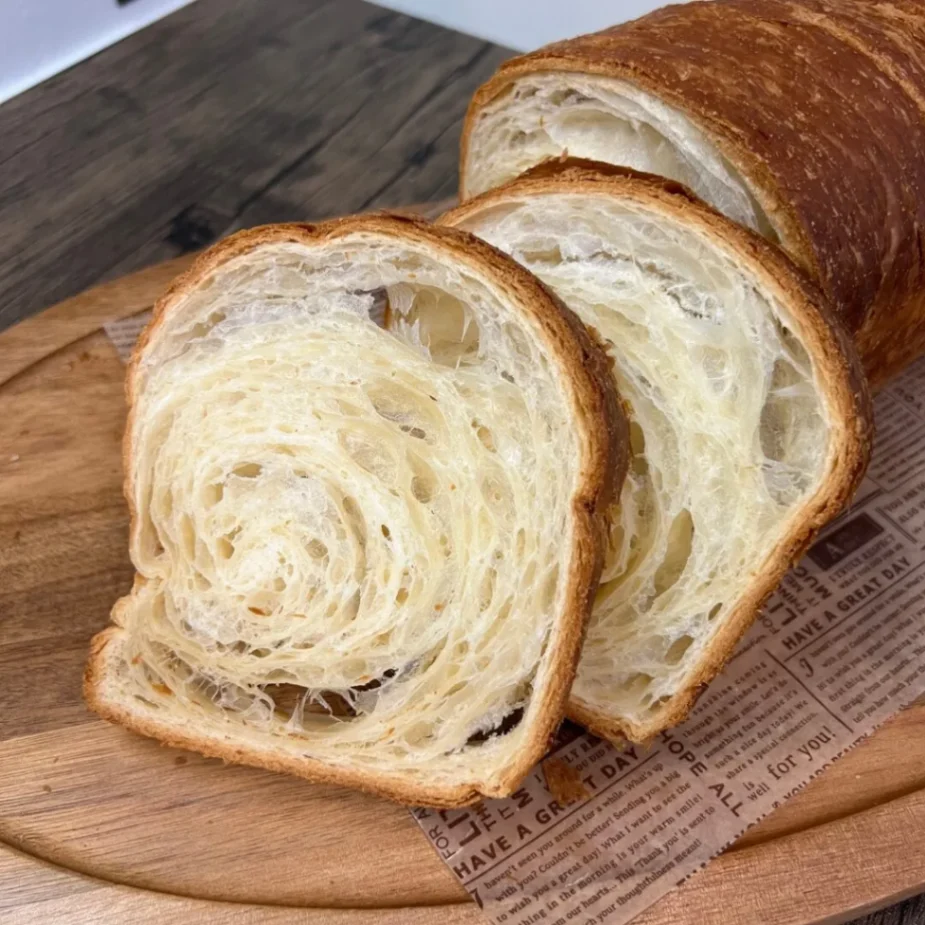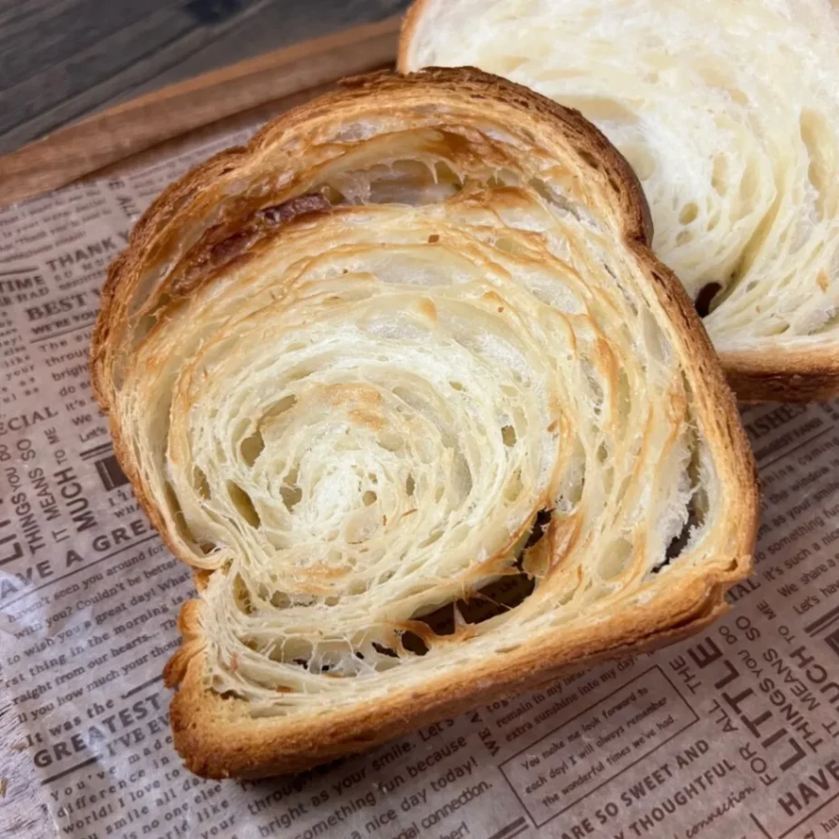 見た目は手のひらサイズの可愛らしい食パン。でも断面をよく見ると、しっかりクロワッサン特有の渦巻き状になっていて、気泡が大きめ。これがサクサクの秘密なんですね。