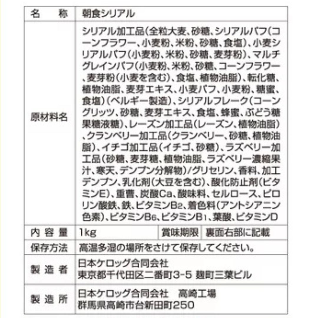 | 主な原材料 | 全粒オーツ麦、シリアルパフ、ドライフルーツ(イチゴ等)、カボチャの種 |