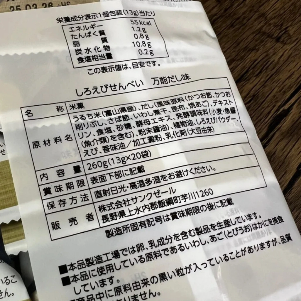 | 原材料 | うるち米(富山県産)、しろえびパウダー、えび、万能だし粉末など |