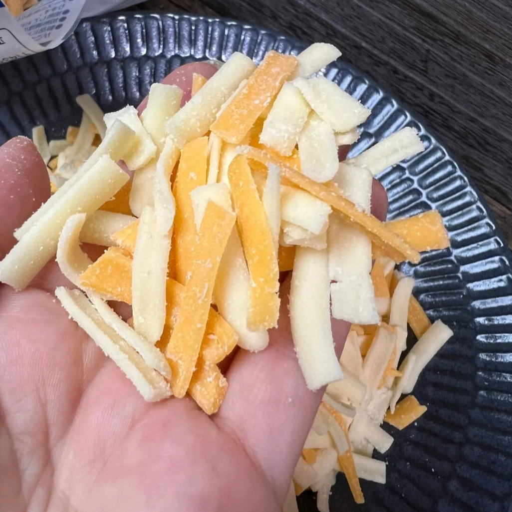 袋を開けた瞬間、まず目に入るのが綺麗なオレンジと白のコントラスト。 これ、実はチェダーチーズ(オレンジ)とモッツァレラ系(白)のミックスだと思われます(※原材料にはナチュラルチーズとしか書かれていませんが、おそらくそんな感じです!笑)。