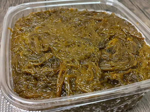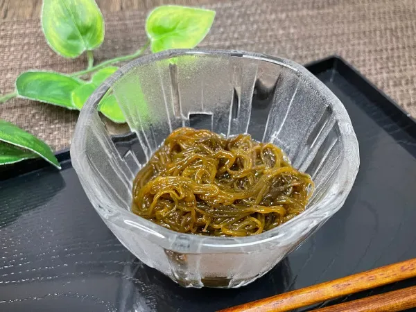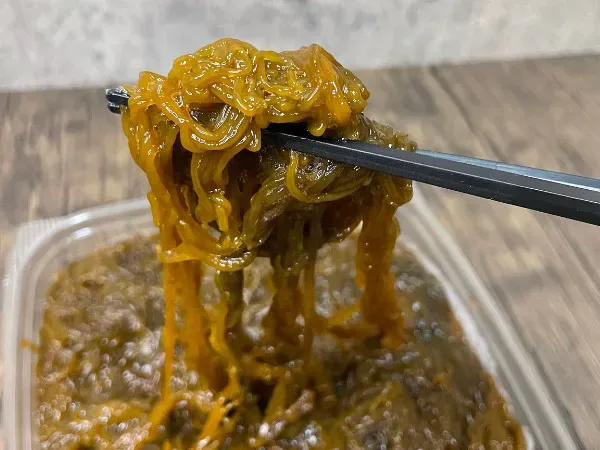一番の驚きはその「太さ」と「食感」です。 箸で持ち上げると、一本一本がしっかりしていて、スーパーの細いもずくとは明らかに見た目から違います。