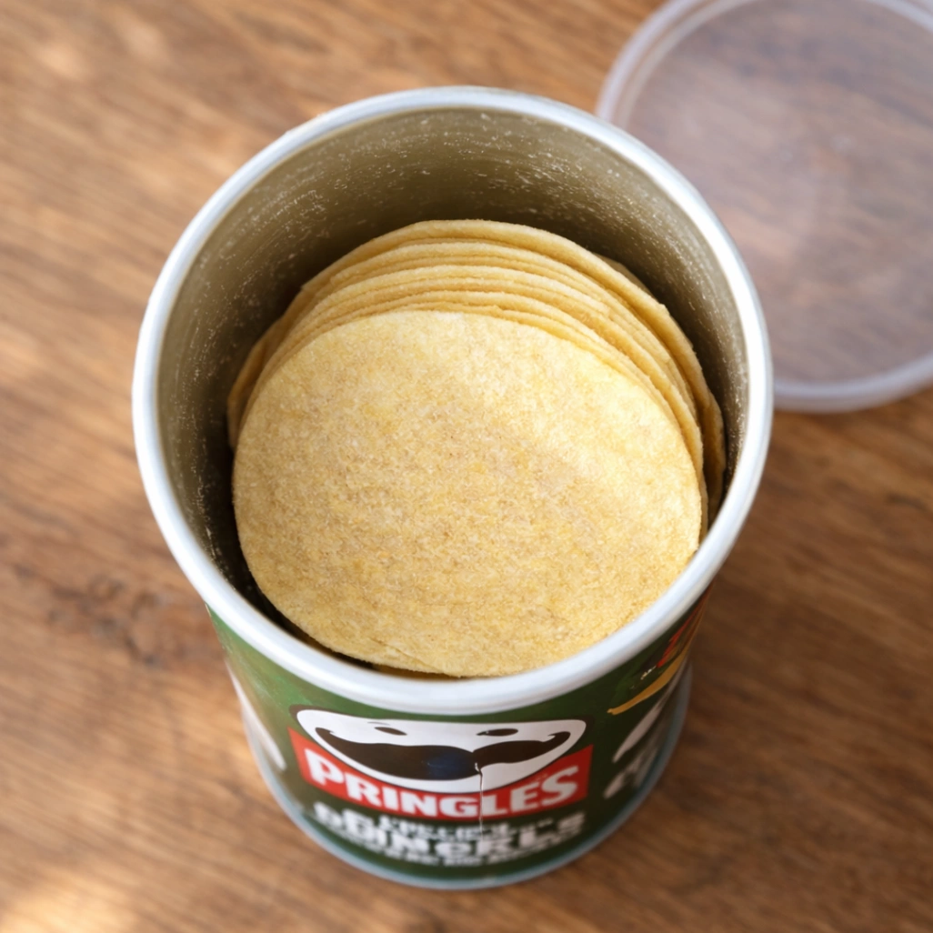 プリングルズの蓋って意外と密閉性が甘いので、そのまま放置すると翌日には「しなっ」としちゃいます。 もし湿気てしまったら、お皿に広げてレンジで20秒ほど温めると少し復活するので試してみてくださいね。