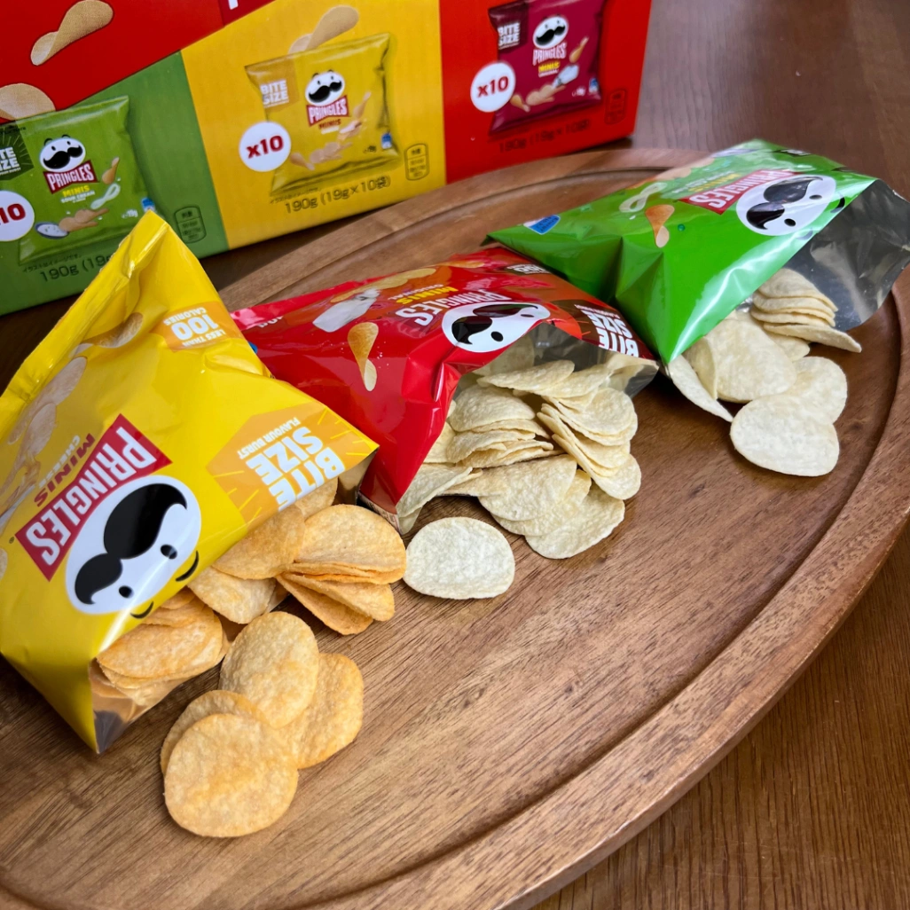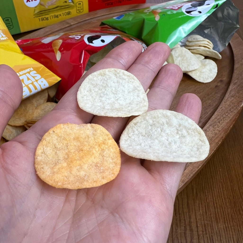 A:はい、あの独特の成形ポテトチップスの形ですが、かなり小さいです。普通のプリングルズは楕円形ですが、こちらはどちらかというと正円に近い、一口サイズ。小さなお子さんの口でも、こぼさず一口で食べられる絶妙なサイズ感ですよ。