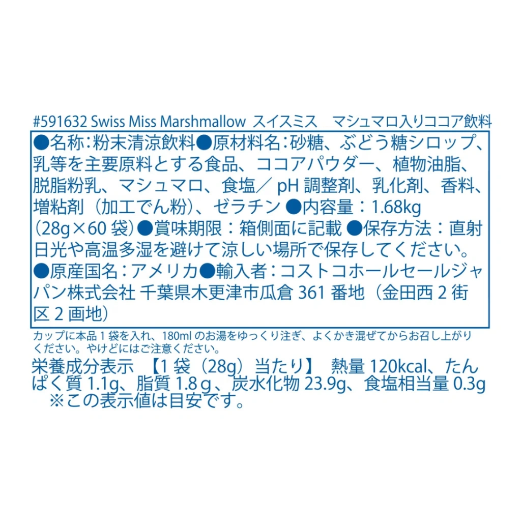 コストコの飲料コーナーで、ひときわ大きな存在感を放っている水色の箱。「スイスミス ミルクチョコレートココア(マシュマロ入り)」、見たことありますよね?