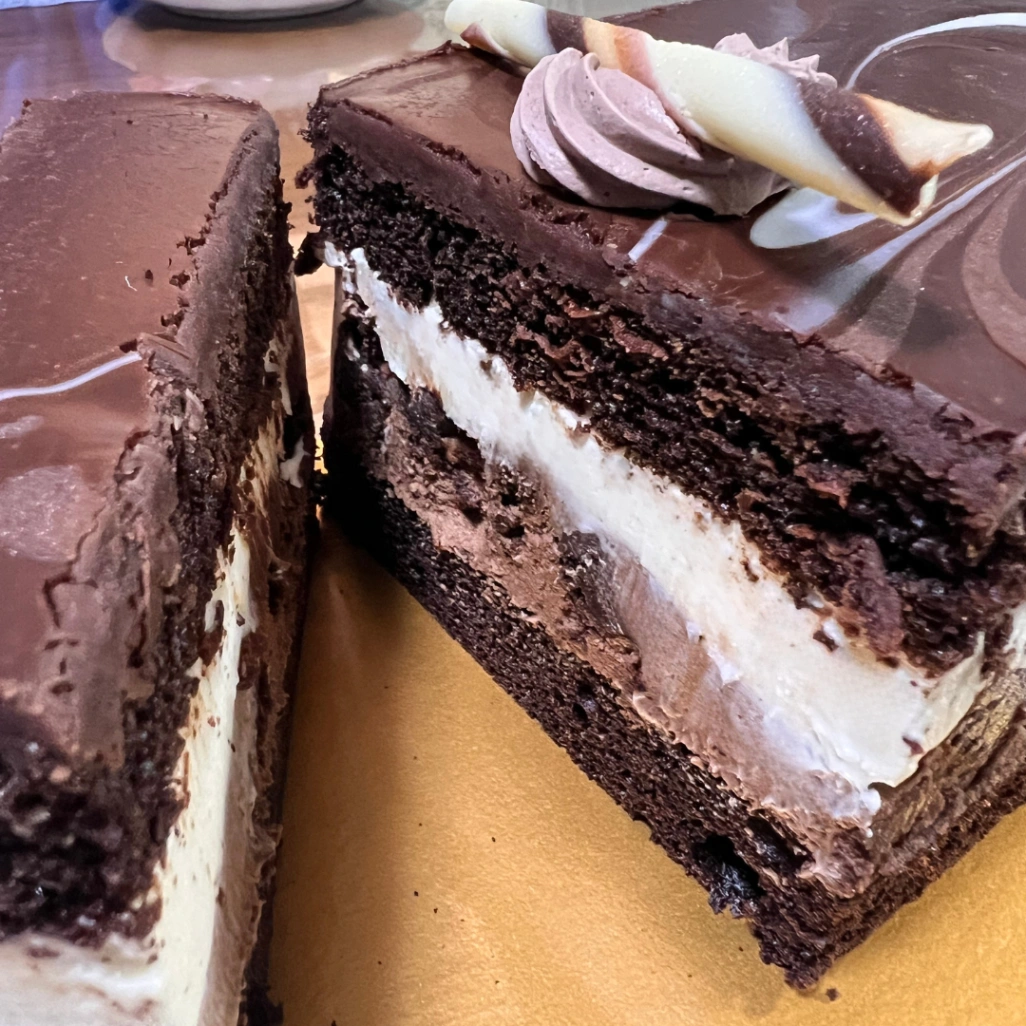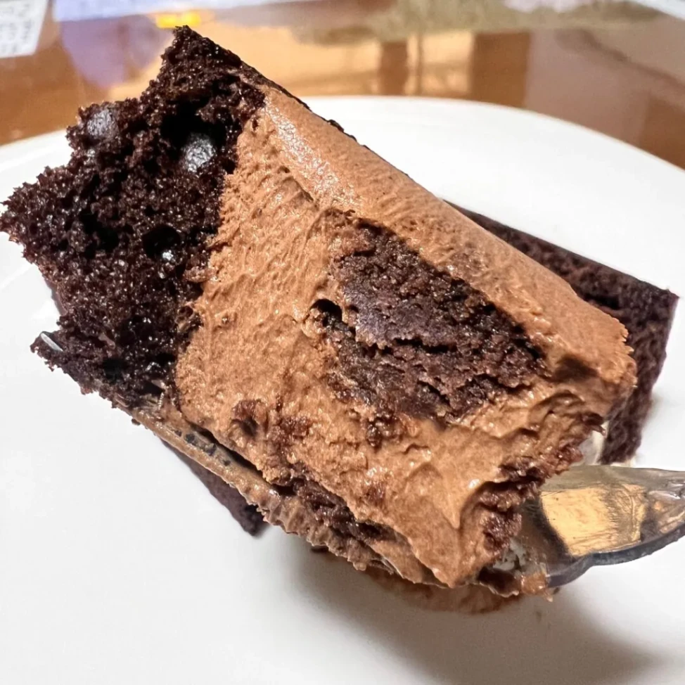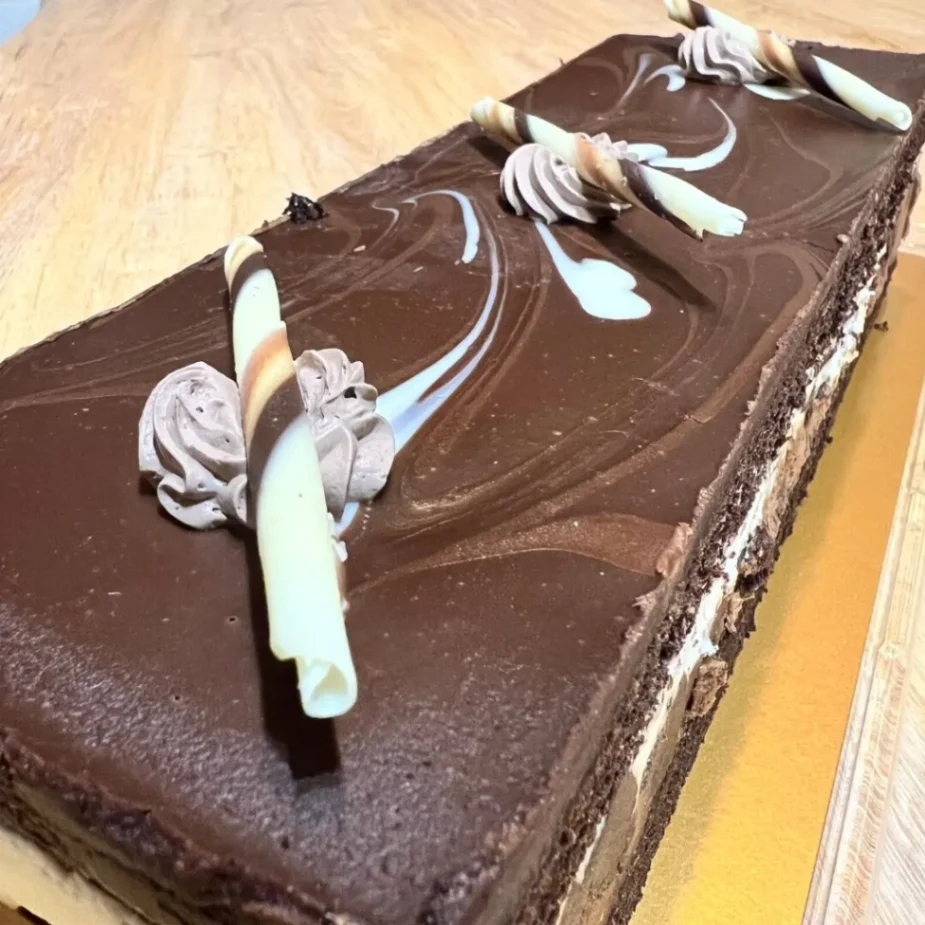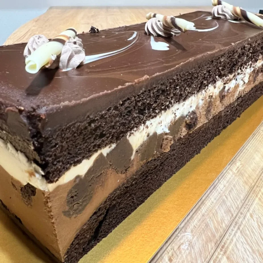 - 3種のムース層:2種類のチョコムースに、白い「クリームチーズムース」がサンドされています。このチーズムースが秀逸で、チョコの重厚感の中に絶妙な「抜け感」と爽やかさを与えてくれるんです。