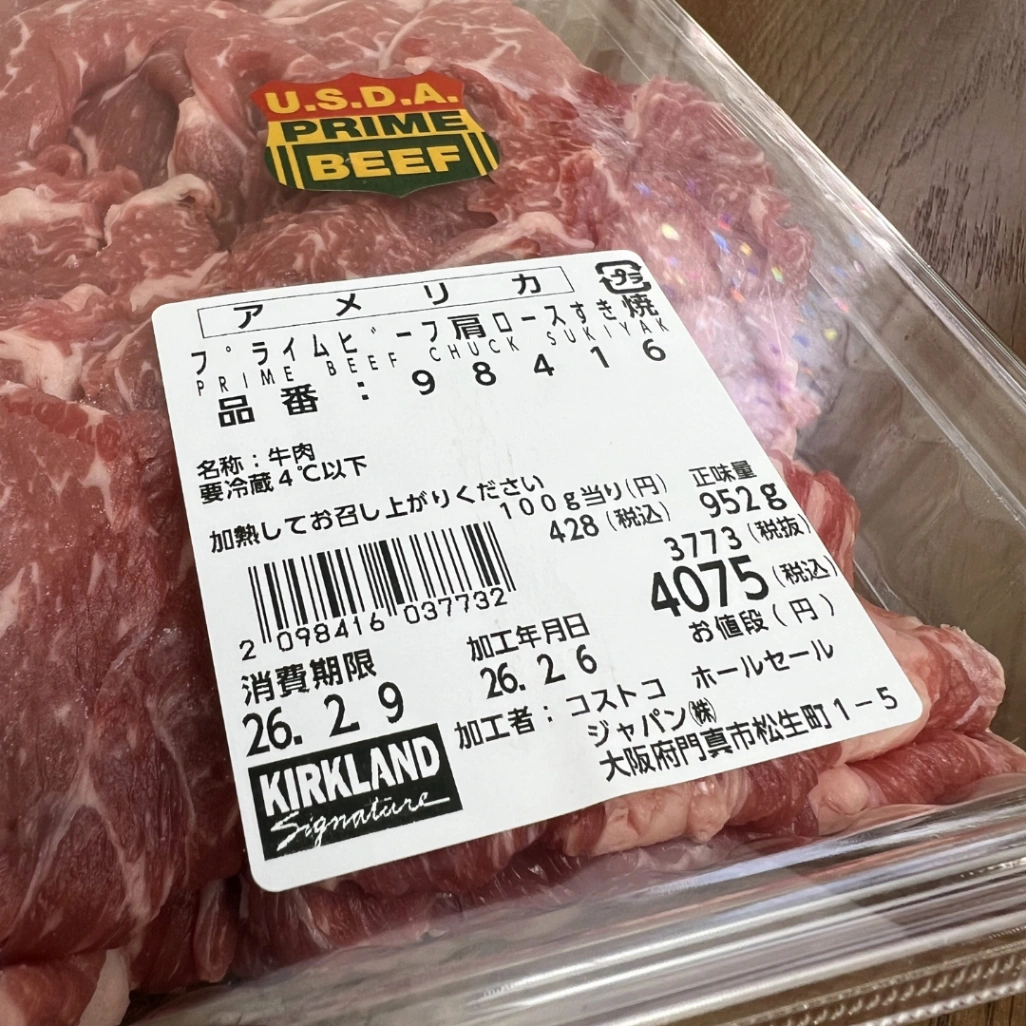 コストコの精肉コーナーで、ひときわ輝く赤身とサシのバランスが美しい「アメリカ産 チルドビーフ プライム 肩ロースすき焼き」。でも、1キロ弱という大容量を前に、カートに入れるのをためらってしまう方も多いですよね。